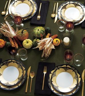 Even something as simple as scattering fall pumpkins, corn, squash with a few votives can have a big impact. It's the texture and color of the vegetables that really says Thanksgiving.